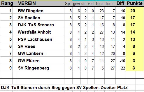 Nach den Ergebnissen aus den Vorrunden konnte nur der Weseler SV oder BW Dingden, jeweils ungeschlagen mit 26 Punkten, den 1. Platz erreichen.