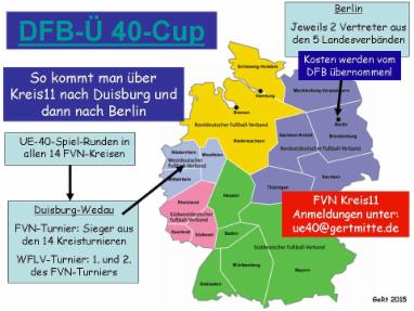 Diese zwei Mannschaften haben sich für das UE-40-Endturnier im Rahmen der Veranstaltung „Festival des Breitenfußballs 2016“ in der Sportschule Wedau (Samstag, 11.6.2016, 10.00 Uhr bis 14.45 Uhr) qualifiziert. Hierbei ist dann auch eine Weiterqualifizierung für das westdeutsche WFLV-Turnier möglich.